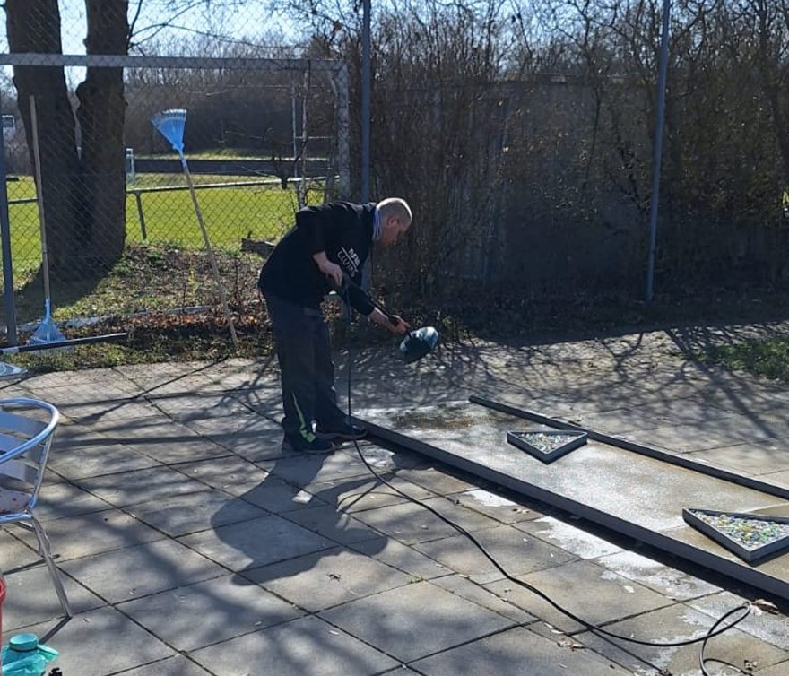 Jan rückte dem Schmutz mit Hochdruck und Bürste zuleibe.