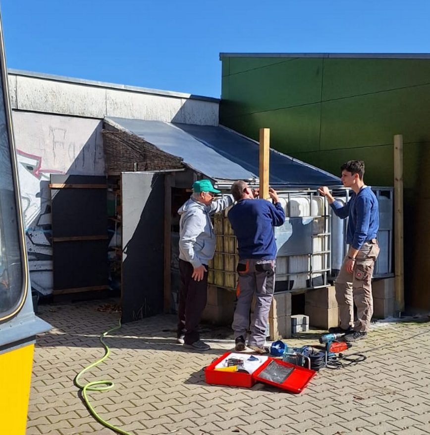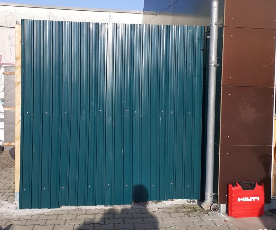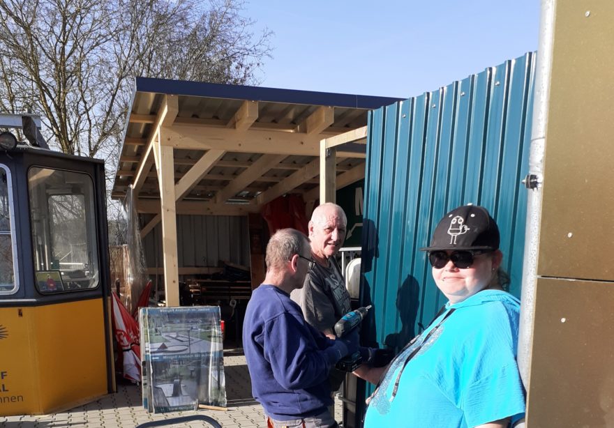 Bei der Verkleidung mit Trapezblech ging der Thomas dem Frank fleißig zur Seite, Sylvia sorgte dafür, dass auch immer Material zur Hand war.